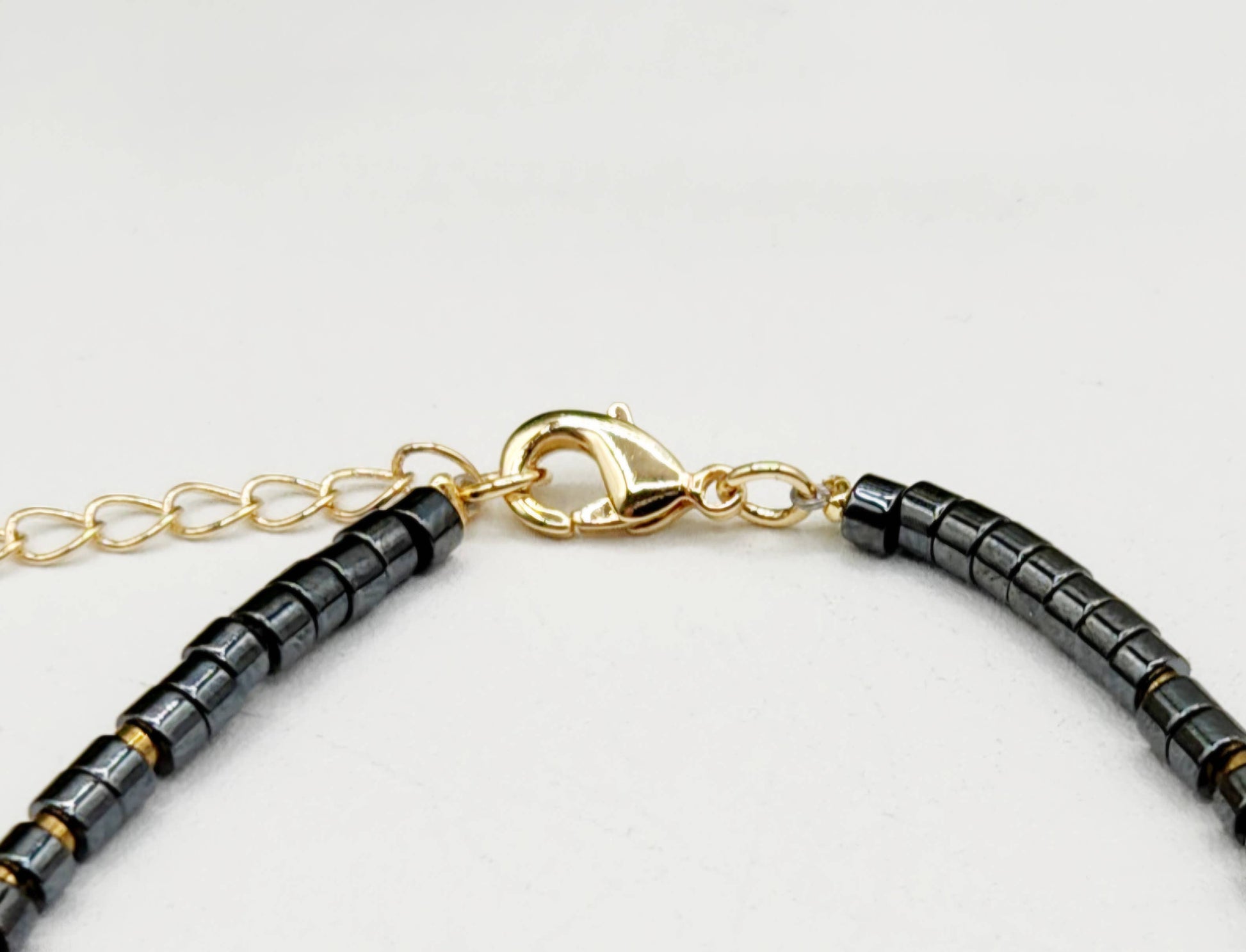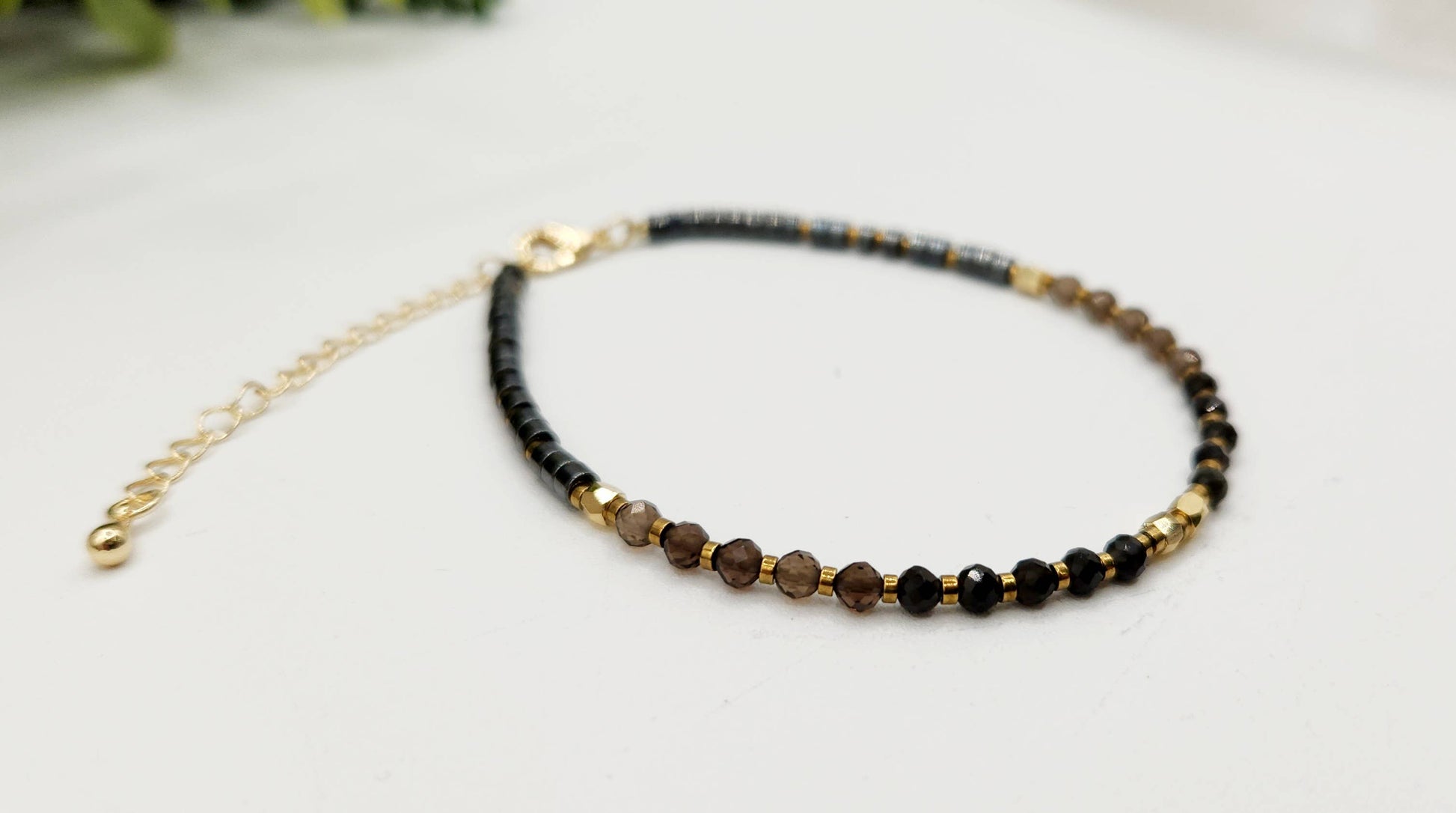 This beautiful bracelet has Black Obsidian and Smoky Quartz 3mm faceted semi-precious gemstones and 3mm Hematite Heishi gemstone beads with gold color metal findings.